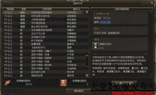 《天堂2私服发布站》任务指南系统是一项必不可少的工具,它能够为玩家提供NPC定位、地图指引、怪物标示、任务道具数量提示等实用功能,帮助玩家轻松完成任务。如果你想接洽任务,那么不妨试试《天堂2私服发布站》任务指南系统,它一定能为你提供很大的帮助!